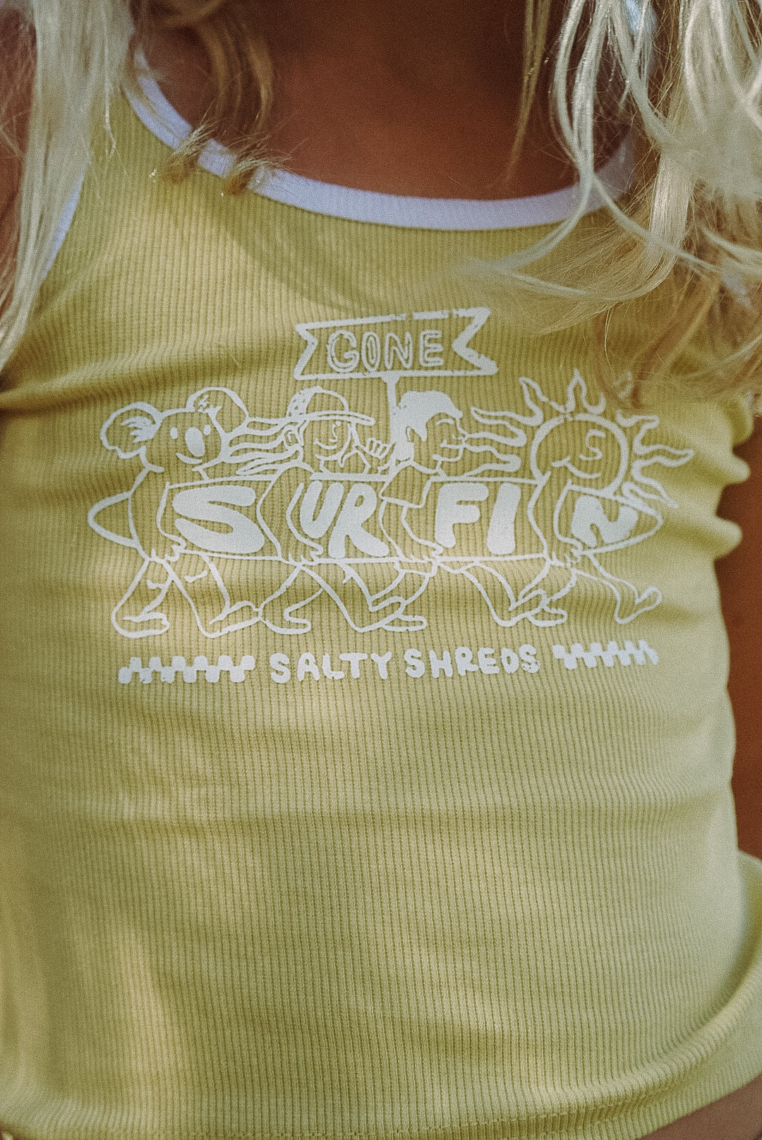The ultimate ringer tank for our salty ladies little & big! Designed from 100% organic cotton, featuring our fresh new ' gone surfin' artwork, these tanks are an absolute vibe, and the comfiest addition to your wardrobe.